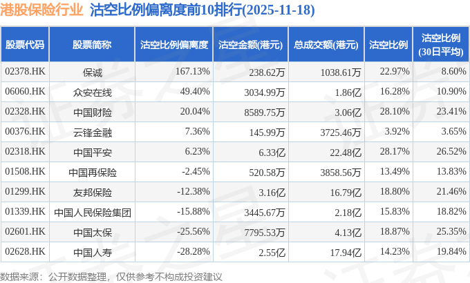 证券之星消息,11月18日港交所披露数据显示,当日港股保险行业的21只个股中有17只被沽空,总沽空股数为4474.44万股,总沽空金额为15.15亿元(港元),而当日保险行业的总成交金额为77.83亿元(港元),沽空比例为19.46%。当日保险行业总体跌3.03%。