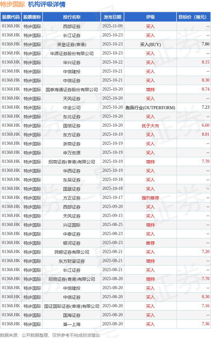 截至2025年11月18日收盘,特步国际(01368.HK)报收于5.82港元,下跌2.18%,成交量557.75万股,成交额3262.87万港元。投行对该股的评级以买入为主,近90天内共有24家投行给出买入评级,近90天的目标均价为7.71港元。西部证券最新一份研报给予特步国际买入评级。
