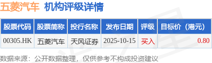 截至2025年11月19日收盘,五菱汽车(00305.HK)报收于0.47港元,下跌1.06%,成交量412.0万股,成交额189.96万港元。投行对该股的评级以买入为主,近90天内共有1家投行给出买入评级,近90天的目标均价为0.8港元。天风证券最新一份研报给予五菱汽车买入评级,目标价0.8港元。