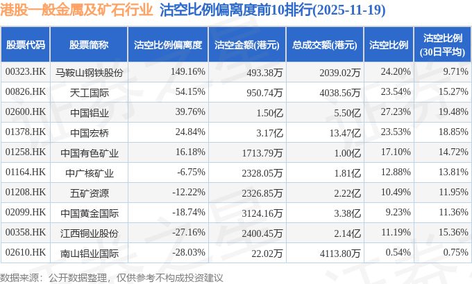 从沽空比例偏离度来看,马鞍山钢铁股份、天工国际、中国铝业沽空比例偏离度位居行业前三,分别为149.16%、54.15%、39.76%。
