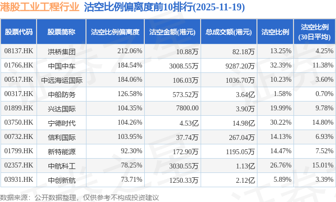 从沽空比例偏离度来看,洪桥集团、中国中车、中远海运国际沽空比例偏离度位居行业前三,分别为212.06%、184.54%、184.06%。