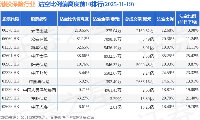 证券之星消息,11月19日港交所披露数据显示,当日港股保险行业的21只个股中有16只被沽空,总沽空股数为4594.64万股,总沽空金额为13.7亿元(港元),而当日保险行业的总成交金额为67.59亿元(港元),沽空比例为20.28%。当日保险行业总体跌0.13%。