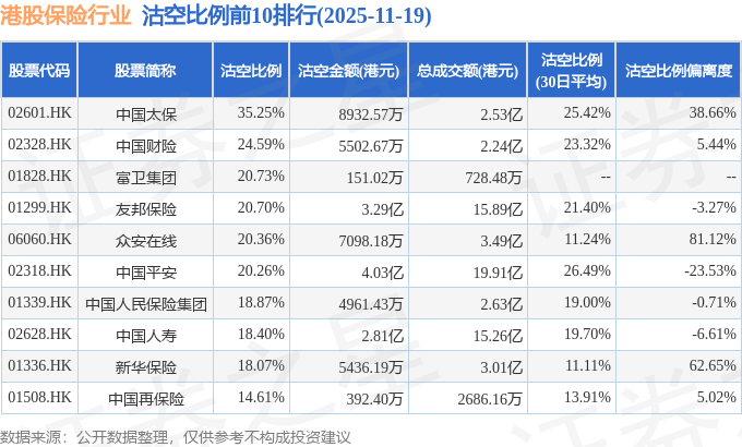 从沽空比例来看,中国太保、中国财险、富卫集团沽空比例位居行业前三,分别为35.25%、24.59%、20.73%。