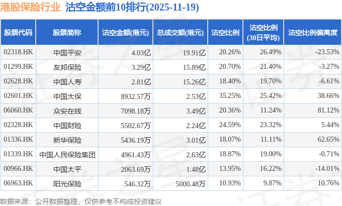 从沽空金额来看,中国平安、友邦保险、中国人寿沽空金额位居行业前三,分别为4.03亿港元、3.29亿港元、2.81亿港元。