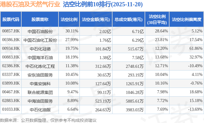 从沽空比例来看,中国石油股份、中国石油化工股份、中石化冠德沽空比例位居行业前三,分别为30.11%、27.99%、19.75%。