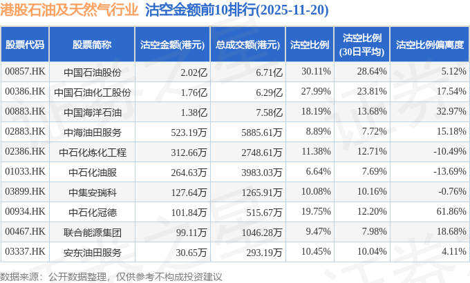 从沽空金额来看,中国石油股份、中国石油化工股份、中国海洋石油沽空金额位居行业前三,分别为2.02亿港元、1.76亿港元、1.38亿港元。