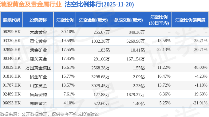 从沽空比例来看,大唐黄金、灵宝黄金、紫金矿业沽空比例位居行业前三,分别为30.1%、19.59%、17.55%。