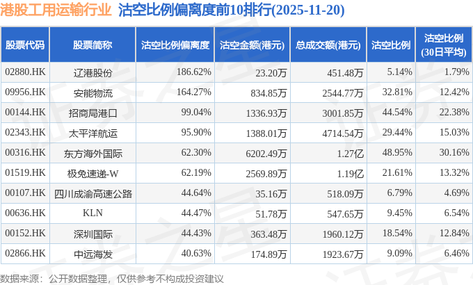 从沽空比例偏离度来看,辽港股份、安能物流、招商局港口沽空比例偏离度位居行业前三,分别为186.62%、164.27%、99.04%。