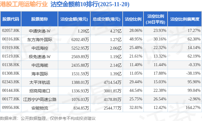 从沽空金额来看,中通快递-W、东方海外国际、中远海控沽空金额位居行业前三,分别为1.2亿港元、6202.49万港元、5252.95万港元。