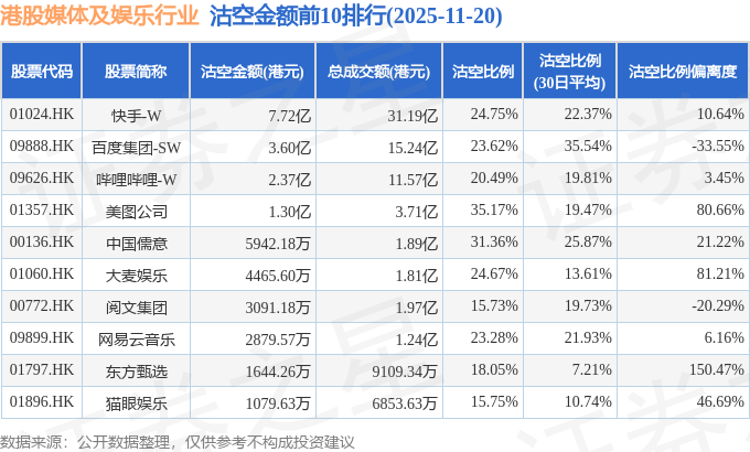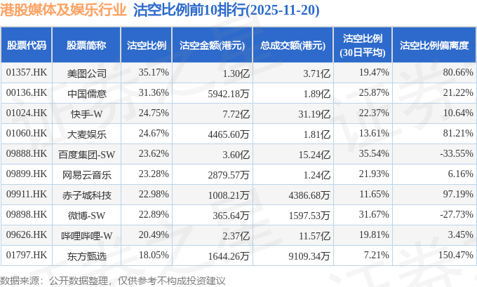 从沽空比例来看,美图公司、中国儒意、快手-W沽空比例位居行业前三,分别为35.17%、31.36%、24.75%。