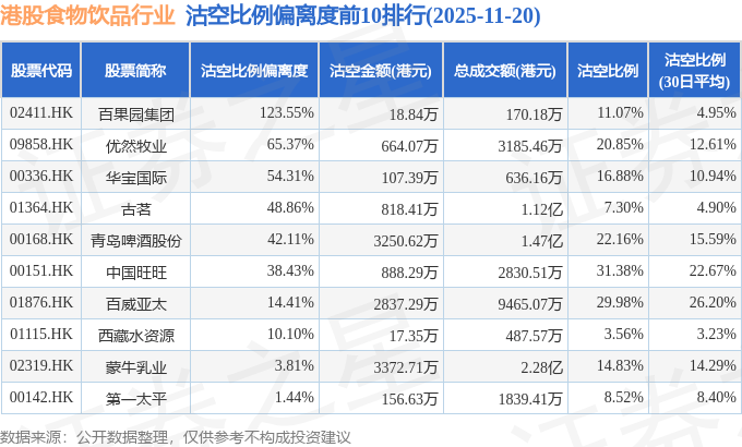 从沽空比例偏离度来看,百果园集团、优然牧业、华宝国际沽空比例偏离度位居行业前三,分别为123.55%、65.37%、54.31%。