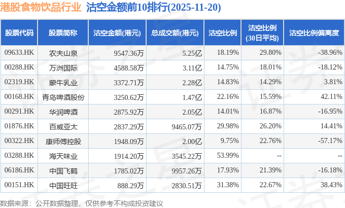 从沽空金额来看,农夫山泉、万洲国际、蒙牛乳业沽空金额位居行业前三,分别为9547.36万港元、4588.58万港元、3372.71万港元。