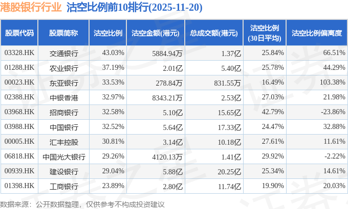 从沽空比例来看,交通银行、农业银行、东亚银行沽空比例位居行业前三,分别为43.03%、37.19%、33.53%。