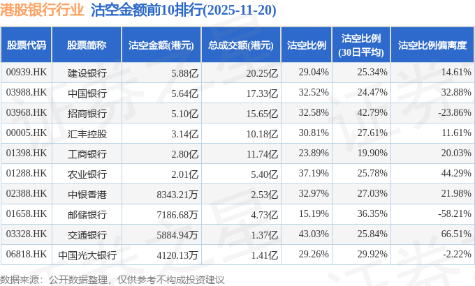 从沽空金额来看,建设银行、中国银行、招商银行沽空金额位居行业前三,分别为5.88亿港元、5.64亿港元、5.1亿港元。