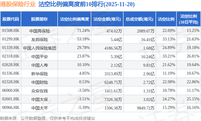 从沽空比例偏离度来看,中国再保险、友邦保险、中国人民保险集团沽空比例偏离度位居行业前三,分别为71.24%、53.18%、29.78%。