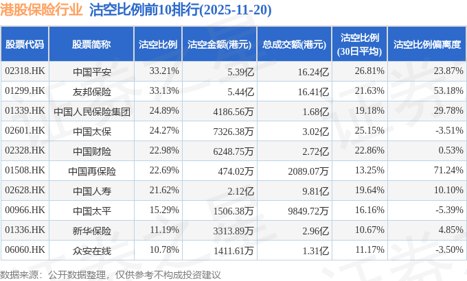 从沽空金额来看,友邦保险、中国平安、中国人寿沽空金额位居行业前三,分别为5.44亿港元、5.39亿港元、2.12亿港元。