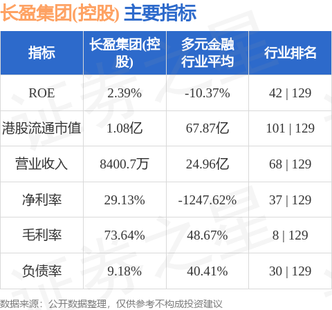 长盈集团(控股)港股市值1.08亿港元,在多元金融行业中排名第101。主要指标见下表: