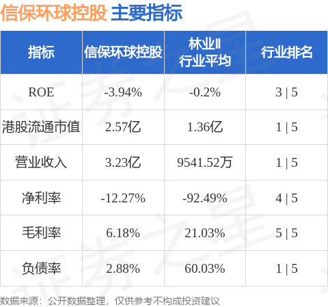信保环球控股港股市值2.57亿港元,在林业Ⅱ行业中排名第1。主要指标见下表: