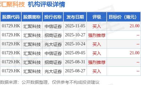 截至2025年11月20日收盘,汇聚科技(01729.HK)报收于14.76港元,上涨3.22%,成交量1416.24万股,成交额2.15亿港元。投行对该股的评级以买入为主,近90天内共有4家投行给出买入评级,近90天的目标均价为21港元。中信证券最新一份研报给予汇聚科技买入评级,目标价21港元。