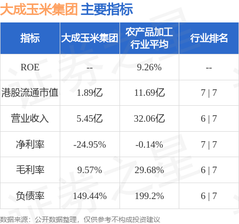 大成玉米集团港股市值1.89亿港元,在农产品加工行业中排名第7。主要指标见下表: