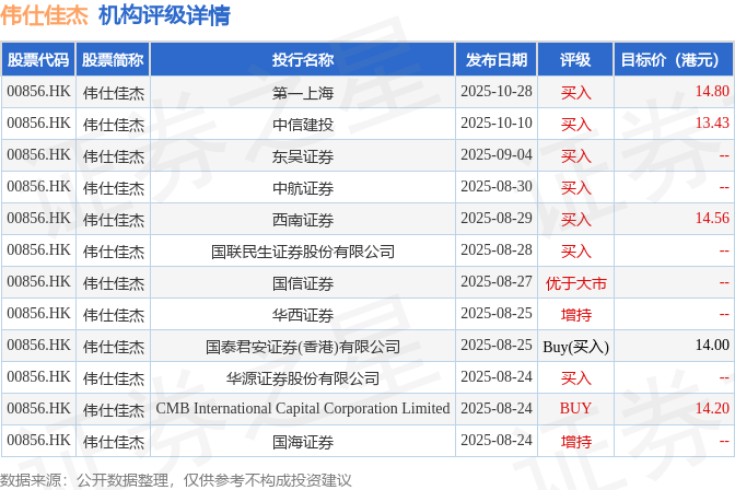 投行对该股的评级以买入为主,近90天内共有7家投行给出买入评级,近90天的目标均价为14.2港元。第一上海最新一份研报给予伟仕佳杰买入评级,目标价14.8港元。
