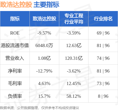 致浩达控股港股市值6048万港元,在专业工程行业中排名第81。主要指标见下表:
