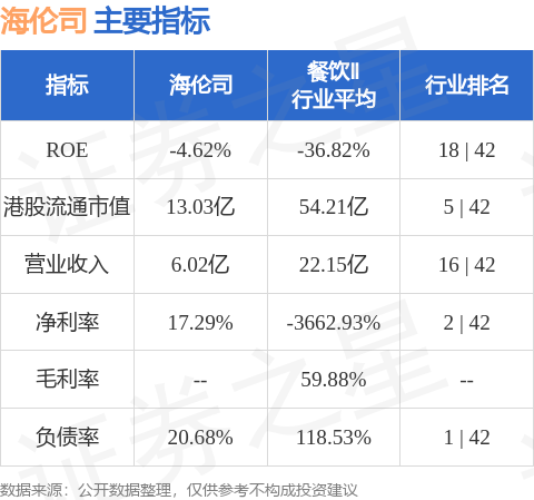 海伦司港股市值13.03亿港元,在餐饮Ⅱ行业中排名第5。主要指标见下表: