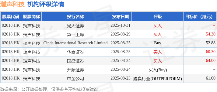 截至2025年11月21日收盘,瑞声科技(02018.HK)报收于37.0港元,下跌2.58%,成交量622.67万股,成交额2.3亿港元。投行对该股的评级以买入为主,近90天内共有4家投行给出买入评级,近90天的目标均价为58.5港元。光大证券最新一份研报给予瑞声科技买入评级。