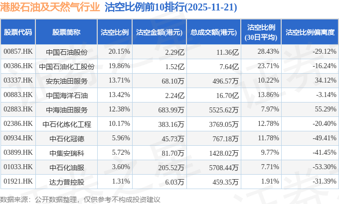 从沽空比例来看,中国石油股份、中国石油化工股份、安东油田服务沽空比例位居行业前三,分别为20.15%、19.86%、13.71%。