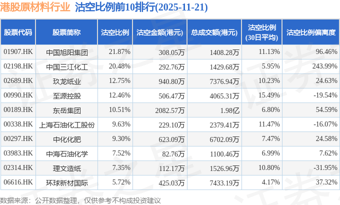 从沽空比例来看,中国旭阳集团、中国三江化工、玖龙纸业沽空比例位居行业前三,分别为21.87%、20.48%、12.75%。