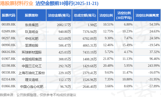 从沽空金额来看,东岳集团、玖龙纸业、中化化肥沽空金额位居行业前三,分别为2082.57万港元、940.8万港元、623.09万港元。