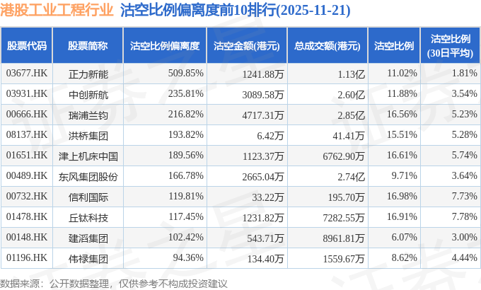 证券之星消息,11月21日港交所披露数据显示,当日港股工业工程行业的219只个股中有57只被沽空,总沽空股数为2.44亿股,总沽空金额为13.19亿元(港元),而当日工业工程行业的总成交金额为133.07亿元(港元),沽空比例为9.91%。当日工业工程行业总体跌3.23%。