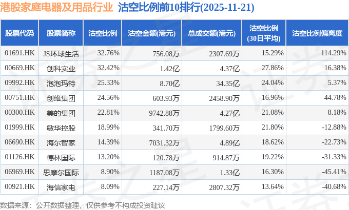 从沽空比例来看,JS环球生活、创科实业、泡泡玛特沽空比例位居行业前三,分别为32.76%、32.42%、25.33%。