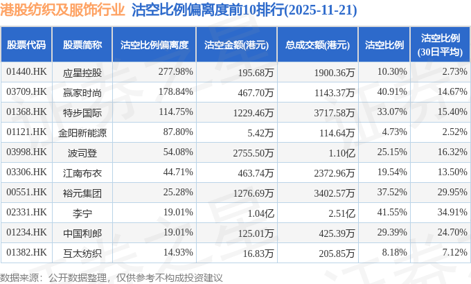 从沽空比例偏离度来看,应星控股、赢家时尚、特步国际沽空比例偏离度位居行业前三,分别为277.98%、178.84%、114.75%。