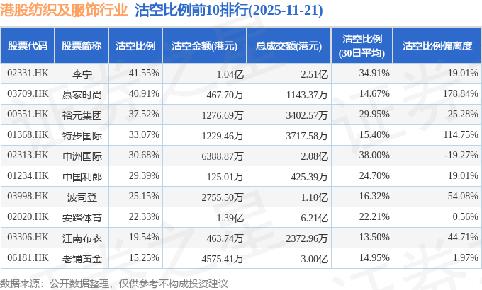 从沽空比例来看,李宁、赢家时尚、裕元集团沽空比例位居行业前三,分别为41.55%、40.91%、37.52%。