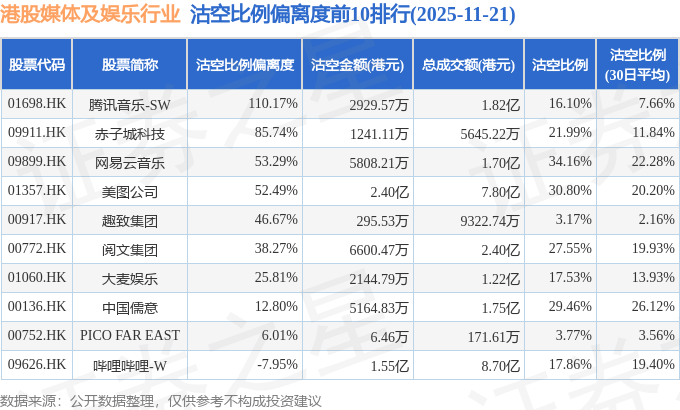 从沽空比例偏离度来看,腾讯音乐-SW、赤子城科技、网易云音乐沽空比例偏离度位居行业前三,分别为110.17%、85.74%、53.29%。