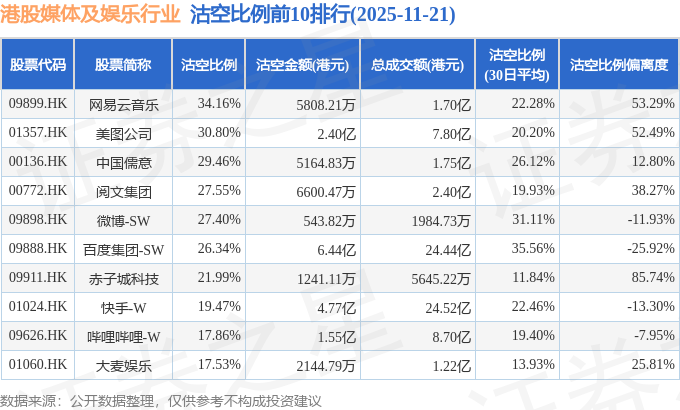 从沽空比例来看,网易云音乐、美图公司、中国儒意沽空比例位居行业前三,分别为34.16%、30.8%、29.46%。