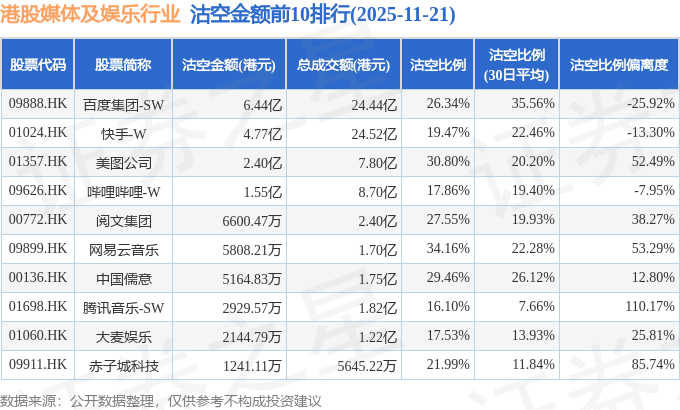 从沽空金额来看,百度集团-SW、快手-W、美图公司沽空金额位居行业前三,分别为6.44亿港元、4.77亿港元、2.4亿港元。