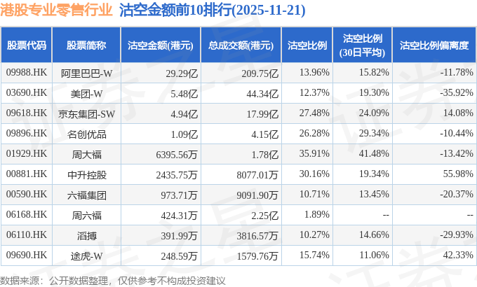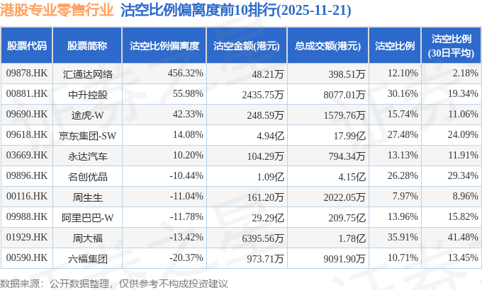 由于港股人民币柜台交易股票成交金额较小,沽空比例普遍偏高,为了避免干扰,已将人民币柜台交易股票从排行表格中剔除。