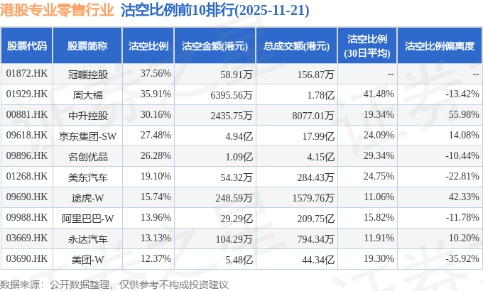 从沽空比例来看,冠轈控股、周大福、中升控股沽空比例位居行业前三,分别为37.56%、35.91%、30.16%。