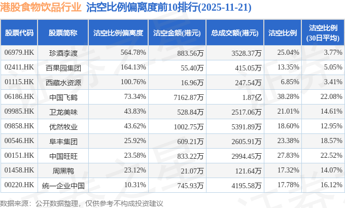 从沽空比例偏离度来看,珍酒李渡、百果园集团、西藏水资源沽空比例偏离度位居行业前三,分别为564.78%、164.13%、100.76%。