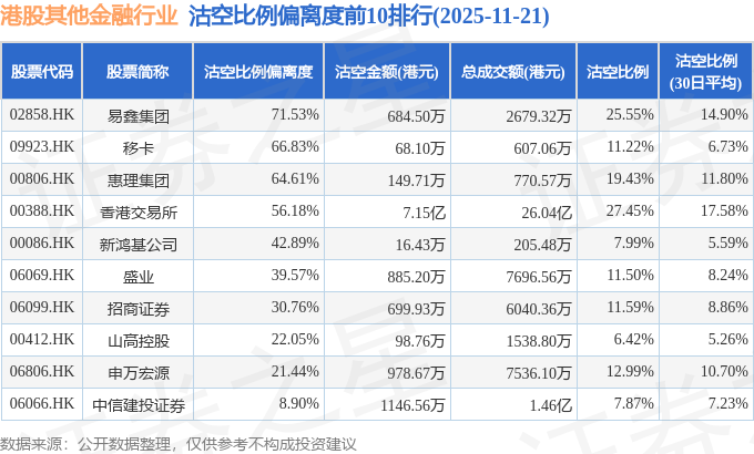 从沽空比例偏离度来看,易鑫集团、移卡、惠理集团沽空比例偏离度位居行业前三,分别为71.53%、66.83%、64.61%。