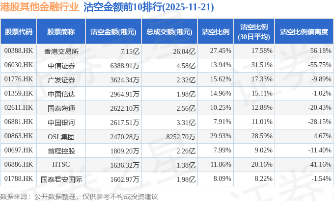 从沽空金额来看,香港交易所、中信证券、广发证券沽空金额位居行业前三,分别为7.15亿港元、6388.91万港元、3624.34万港元。