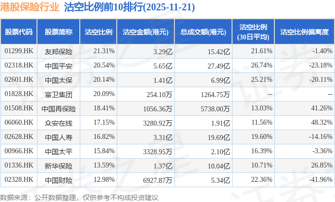 从沽空比例来看,友邦保险、中国平安、中国太保沽空比例位居行业前三,分别为21.31%、20.54%、20.14%。
