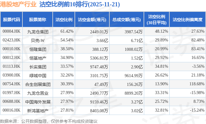 从沽空比例来看,九龙仓集团、贝壳-W、恒隆集团沽空比例位居行业前三,分别为61.42%、54.54%、38.5%。