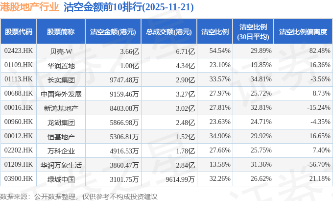 从沽空金额来看,贝壳-W、华润置地、长实集团沽空金额位居行业前三,分别为3.66亿港元、1亿港元、9747.48万港元。