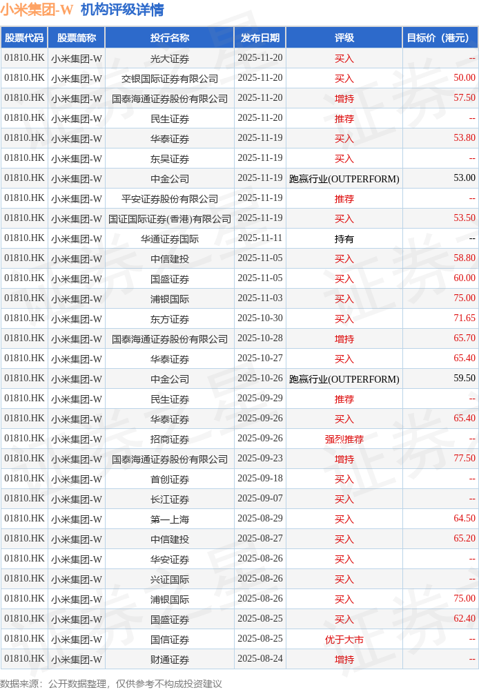 截至2025年11月21日收盘,小米集团-W(01810.HK)报收于38.08港元,上涨1.01%,成交量4.18亿股,成交额158.07亿港元。投行对该股的评级以买入为主,近90天内共有21家投行给出买入评级,近90天的目标均价为62.41港元。国海证券最新一份研报给予小米集团-W增持评级。