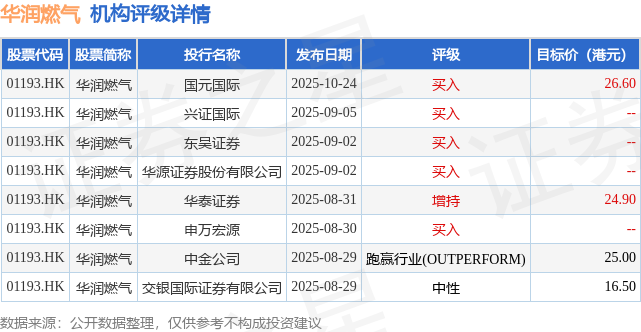截至2025年11月21日收盘,华润燃气(01193.HK)报收于21.02港元,上涨0.38%,成交量621.1万股,成交额1.31亿港元。投行对该股的评级以买入为主,近90天内共有5家投行给出买入评级,近90天的目标均价为23.25港元。国元国际最新一份研报给予华润燃气买入评级,目标价26.6港元。