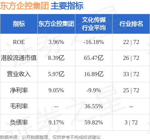 东方企控集团港股市值8.39亿港元,在文化传媒行业中排名第26。主要指标见下表: