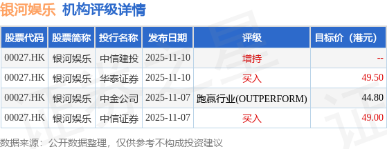 截至2025年11月24日收盘,银河娱乐(00027.HK)报收于39.5港元,上涨2.86%,成交量2562.56万股,成交额10.07亿港元。投行对该股的评级以买入为主,近90天内共有2家投行给出买入评级,近90天的目标均价为47.77港元。中信建投最新一份研报给予银河娱乐增持评级。